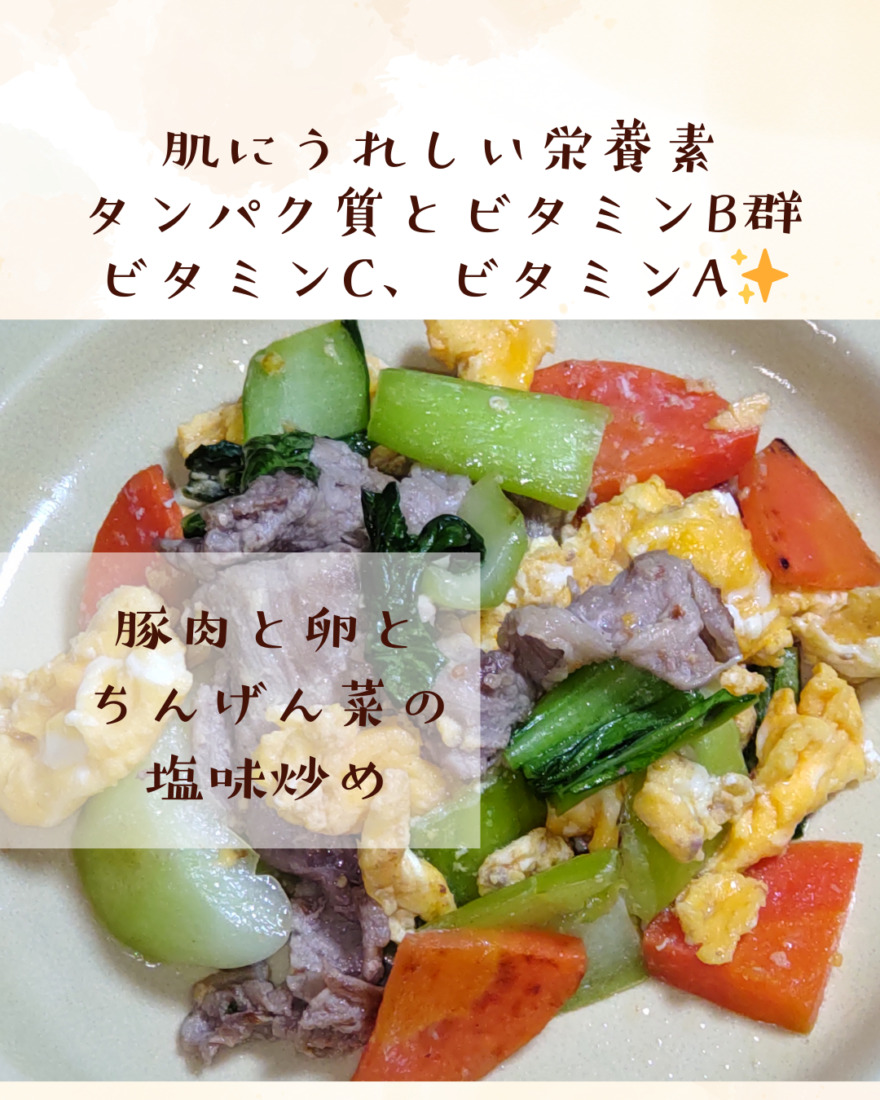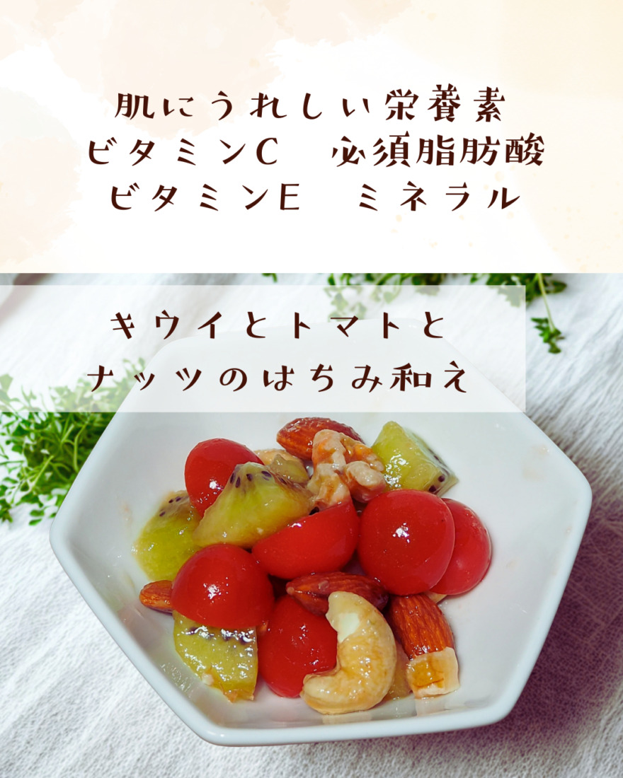 美容レシピ 豚肉と卵とちんげん菜の塩味炒め・キウイとトマトとナッツのはちみつ和え